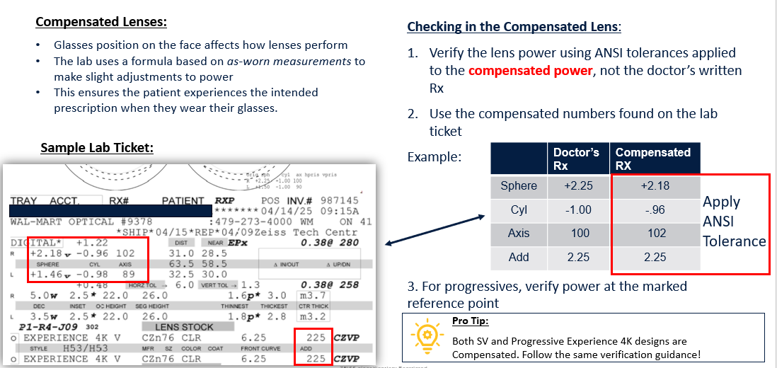 the Experience 4K progressive is a compensated lens. Compensated lenses offer patients clearer vision across the entire surface of the lens. To achieve this, the lens power may differ from the prescribed power written by the doctor. It considers face form, pantoscopic tilt, and vertex distance to ensure your patient experiences the ideal lens power across the entire surface of the lens. When preparing to dispense, the compensation ticket included by CZV and/or the work ticket sent by the WM labs should be used to verify the power.
