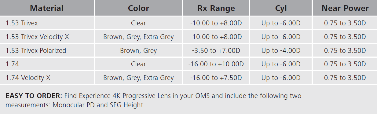 Experience 4K Progressive lenses provide a unique visual perception to your patients. Watch this short video to learn more about the design, demonstrated using the Trivex material. While the example highlights Trivex, the lens design remains consistent across all materials-ensuring the same high-quality experience for every patient.