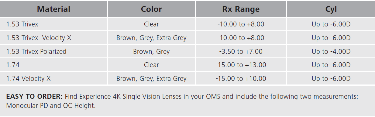 The Experience 4K in Single Vision is available in Trivex and 1.74 High Index.