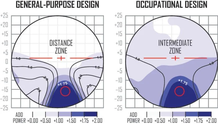 Office lenses are specific to the ergonomics of the workplace, reducing postural stress and tired eyes.